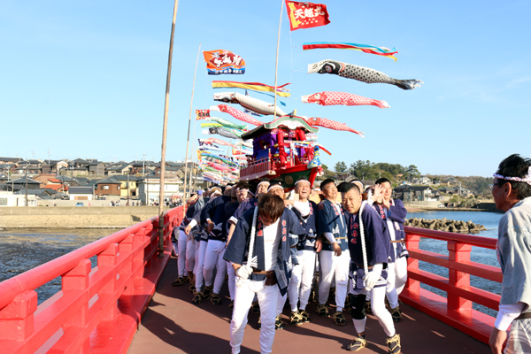 夕刻、雄島橋を渡る船神輿。