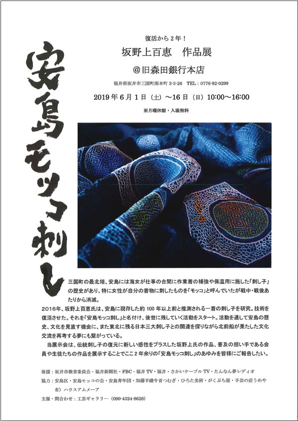 当展示会は、伝統刺し子の復元に新しい感性をプラスした坂野上氏の作品、普及の担い手である会員や生徒たちの作品を展示することで、ここ2年余りの「安島モッコ刺し」のあゆみを皆様にご報告したい。