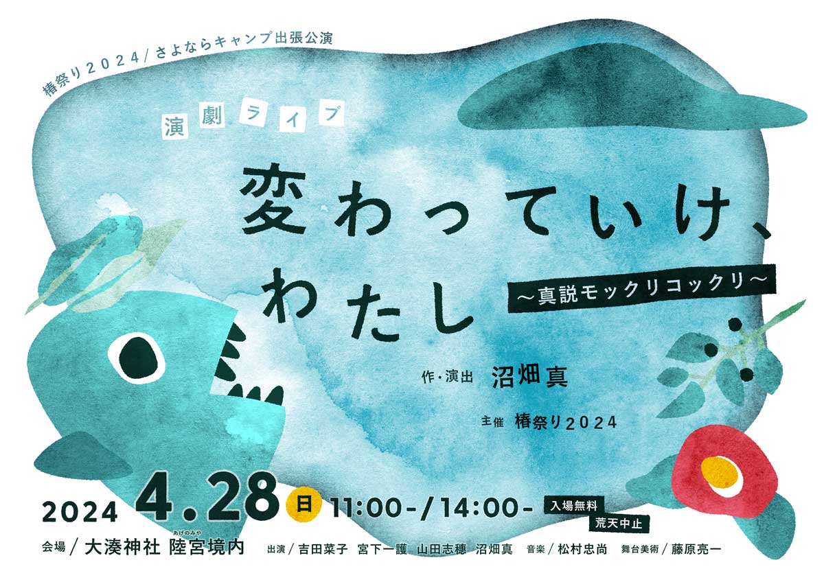 昔々、モックリコックリという大魚が雄島に攻めてきたそうな。 雄島の神様が迎えうち、なんとか平穏を取り戻した安島地区。 そんなモックリコックリも今となっては地域の昔話…… と思いきや、その脅威はまだ消滅していなかった!? 演劇ユニット さよならキャンプが妄想を添えてお届けする 現代版!真説?「モックリコックリ」お見逃しなく! |