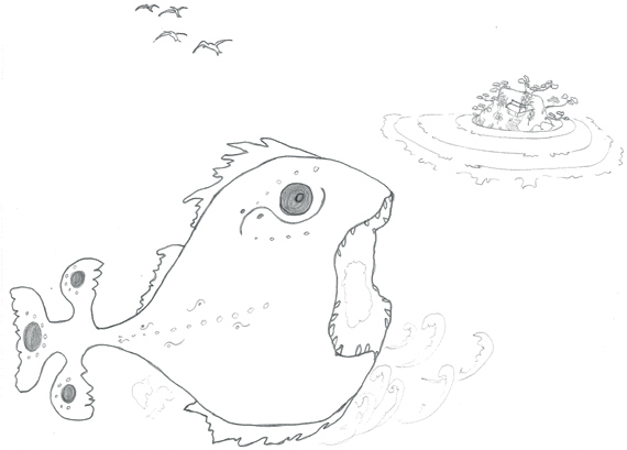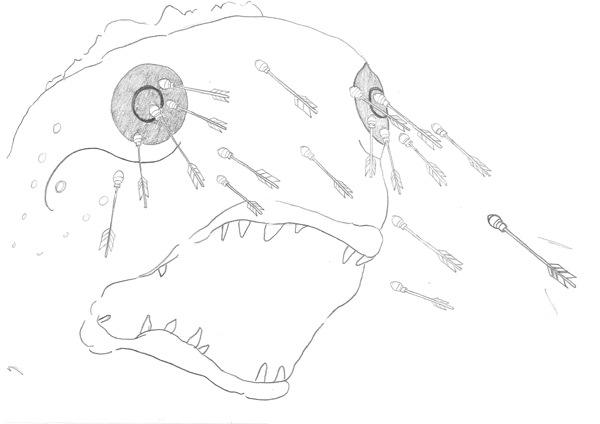 すると、そのモックリコックリに向かって行く一本のかぶら矢は、次第にその数を増し、ついに千本の矢になって、この大きな魚なの両目を打ち抜きました。
